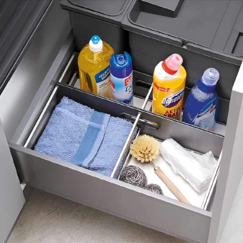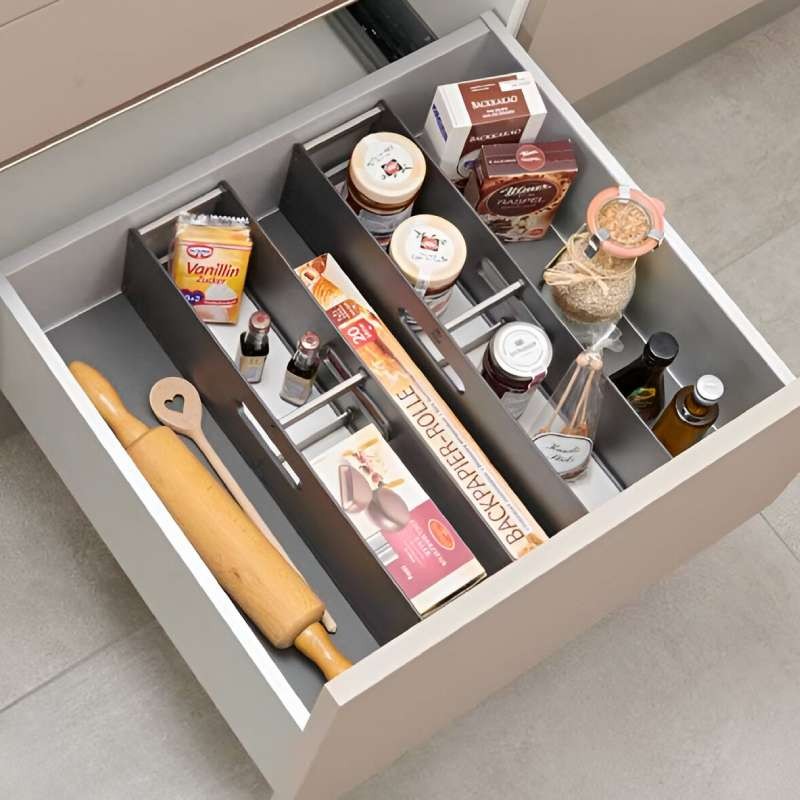 Avec une profondeur de 447 mm, le FlexBox est compatible avec tous les systèmes de tiroirs du marché, ce qui en fait une solution universelle pour l’organisation de l’espace intérieur.