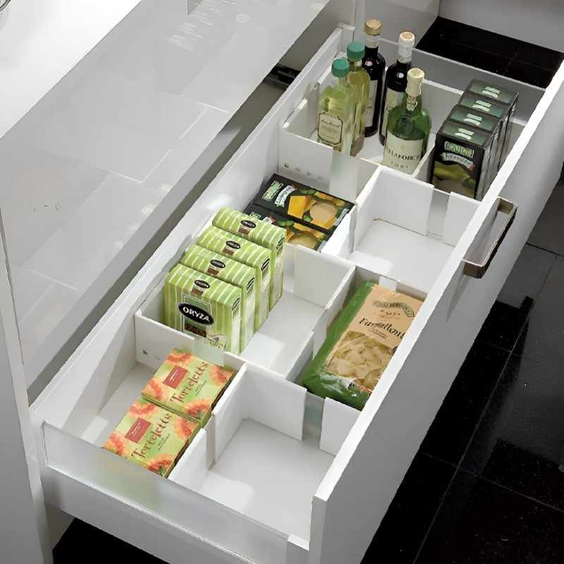 Le système Fusión Flex est composé d’un cadre télescopique réglable qui, combiné avec d’autres à l’intérieur du casserolier, permet d’organiser l’espace de manière simple, efficace et totalement personnalisée. Son design adaptable facilite l’optimisation de l’intérieur du tiroir, créant des compartiments sur mesure selon les besoins de rangement.