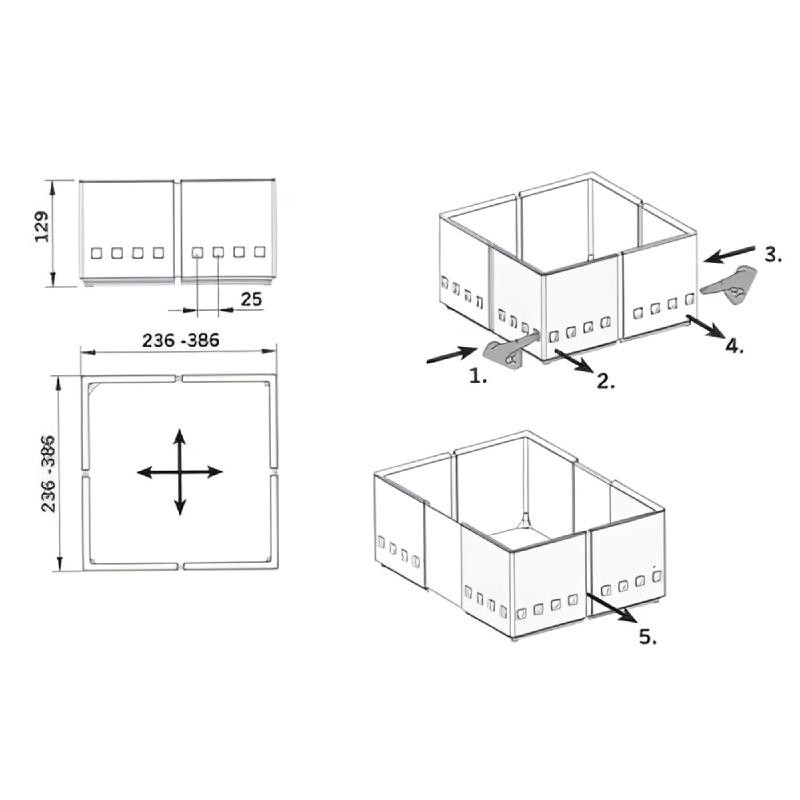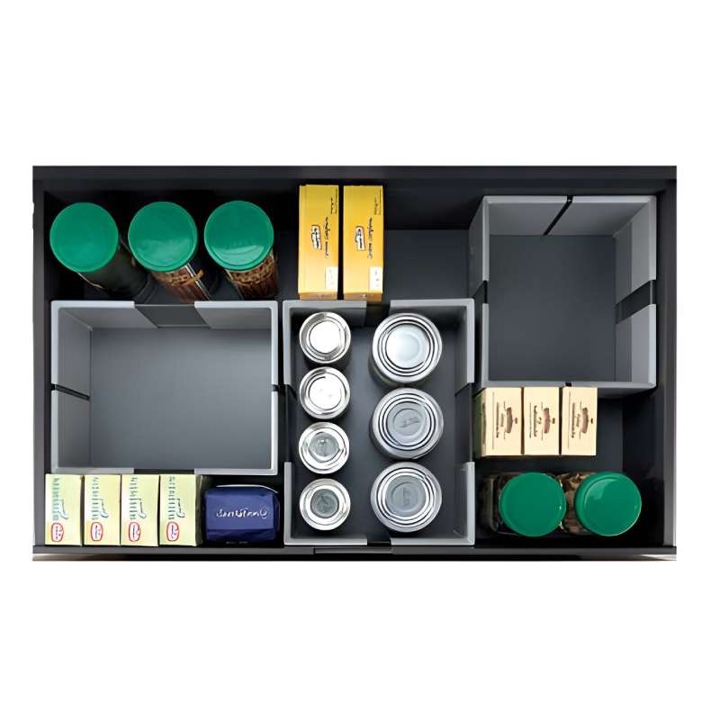 Il dispose d’une base antidérapante pour éviter le mouvement des ustensiles et garantir une plus grande stabilité. Le cadre est réglable dans deux directions (largeur et profondeur), ce qui permet d’utiliser la même référence dans toutes les marques de tiroir sans nécessiter de versions spécifiques.