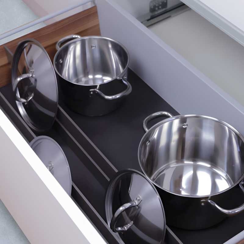 Il s’agit d’un système extrêmement pratique et flexible, capable d’optimiser au maximum l’espace intérieur du casserolier. Pour une finition parfaite, un tapis antidérapant peut être ajouté à la base du tiroir (optionnel).