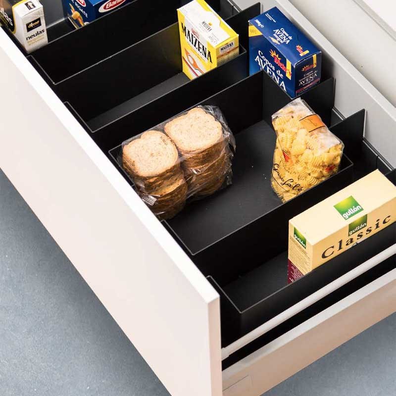 Le set comprend 2 profils, 5 divisions métalliques et 1 tapis antidérapant noir découpable de 900 mm. Lors de la commande, il est nécessaire d’indiquer le modèle du tiroir et la mesure du côté du meuble (16 mm ou 19 mm).