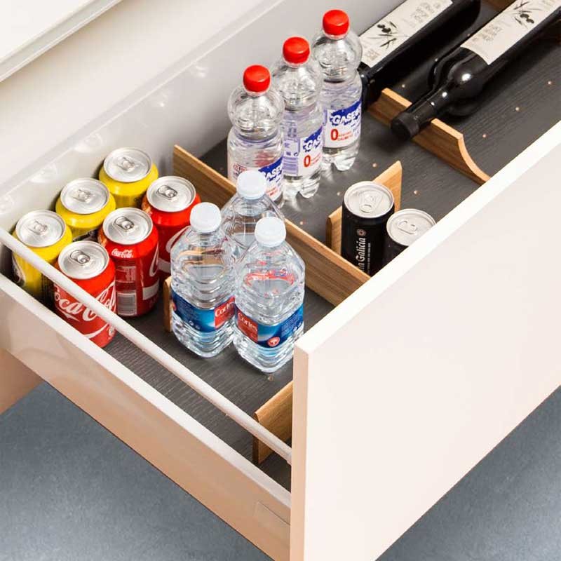 L’association de la finition anthracite avec les accessoires en chêne apporte un contraste élégant et moderne, idéal pour tout type de casserolier, y compris les tiroirs haut de gamme avec côté droit en anthracite. De plus, il est totalement compatible avec les Range-couverts Mix, créant une esthétique uniforme dans tout l’intérieur du meuble.