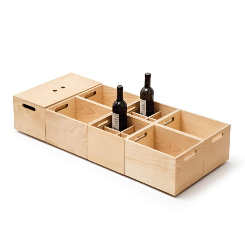 Le système inclut différentes boîtes de plusieurs dimensions, permettant de configurer l’espace intérieur de manière flexible et adaptée aux besoins de l’utilisateur. Certaines des boîtes intègrent des porte-bouteilles intégrés, idéals pour maintenir les bouteilles en position stable et sécurisée.