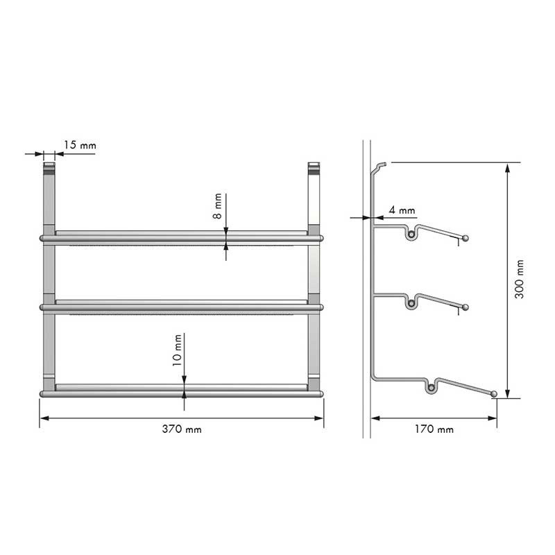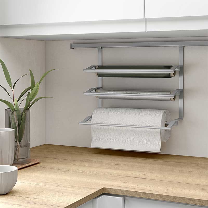 Développez Support mural en acier de couleur argent pour accrocher dans la cuisine, avec trois bars à mettre en place 3 rouleaux de papier de cuisine, de film ou de papier d'aluminium.