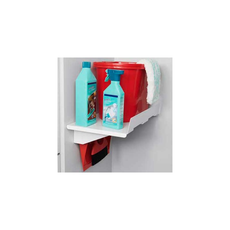 Étagère universelle en métal idéale pour ranger des seaux, des produits de nettoyage et bien plus encore. Le crochet sous l'étagère crée des options de suspension supplémentaires, pour les serviettes et les chiffons, le balai et la pelle à poussière rouge inclus dans l'ensemble.