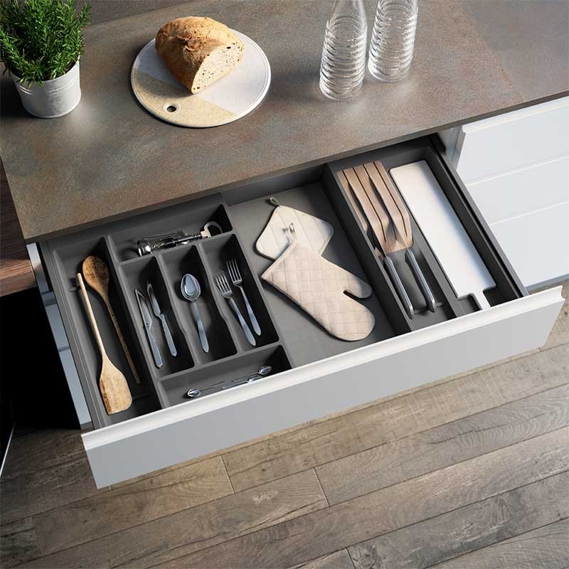 Développez Porte-couverts modulaire en polypropylène anthracite à côté de l'aile de mannequin. Adaptable à n'importe quel tiroir de la cuisine.