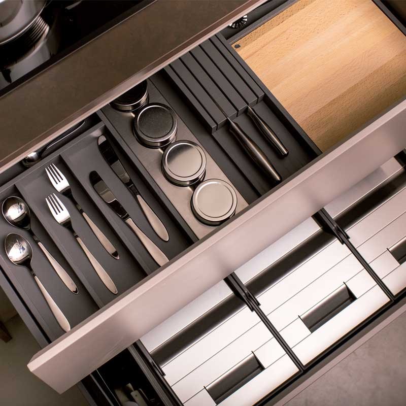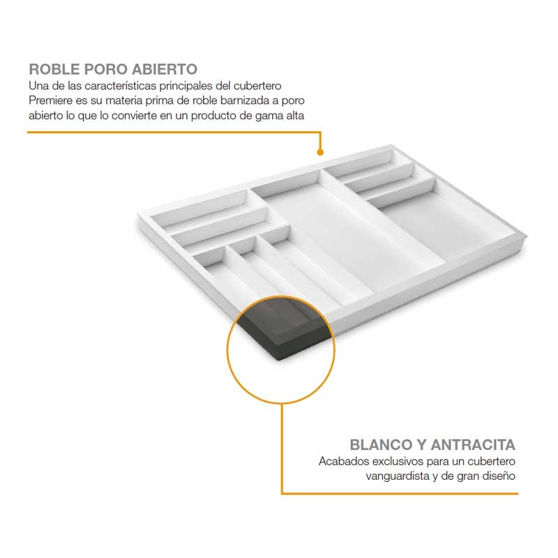 Développez Porte-couverts en bois modèle Premiere pour un tiroir de la cuisine. Disponible en blanc ou anthracite, et pour les différentes mesures de la pièce de mobilier.