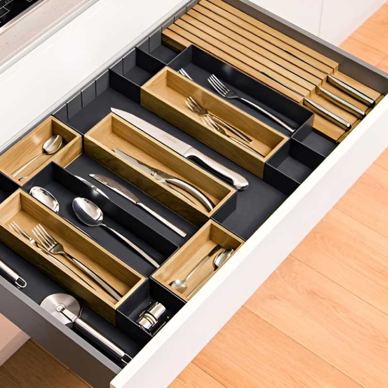 Le Set Open System 1200 permet de créer une distribution intérieure totalement personnalisée et élégante. Ses divisions métalliques en anthracite apportent ordre et résistance, tandis que les boîtes en chêne ajoutent chaleur et une touche naturelle au tiroir. Le tapis antidérapant noir protège la base et évite les déplacements, offrant une expérience d’utilisation confortable et de haute qualité.
