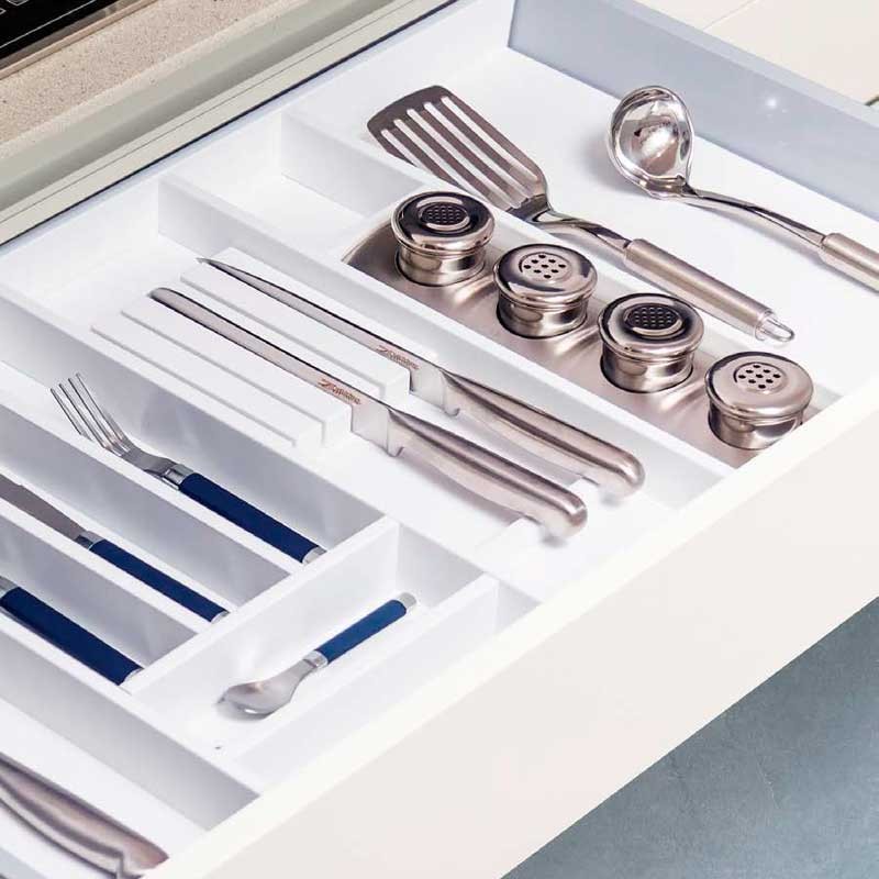 Développez Le porte‑papier pour range‑couverts est un accessoire en aluminium inoxydable pour le logement (B) des range‑couverts laqués en blanc mat, avec une finition et un design spectaculaire et de haute qualité.