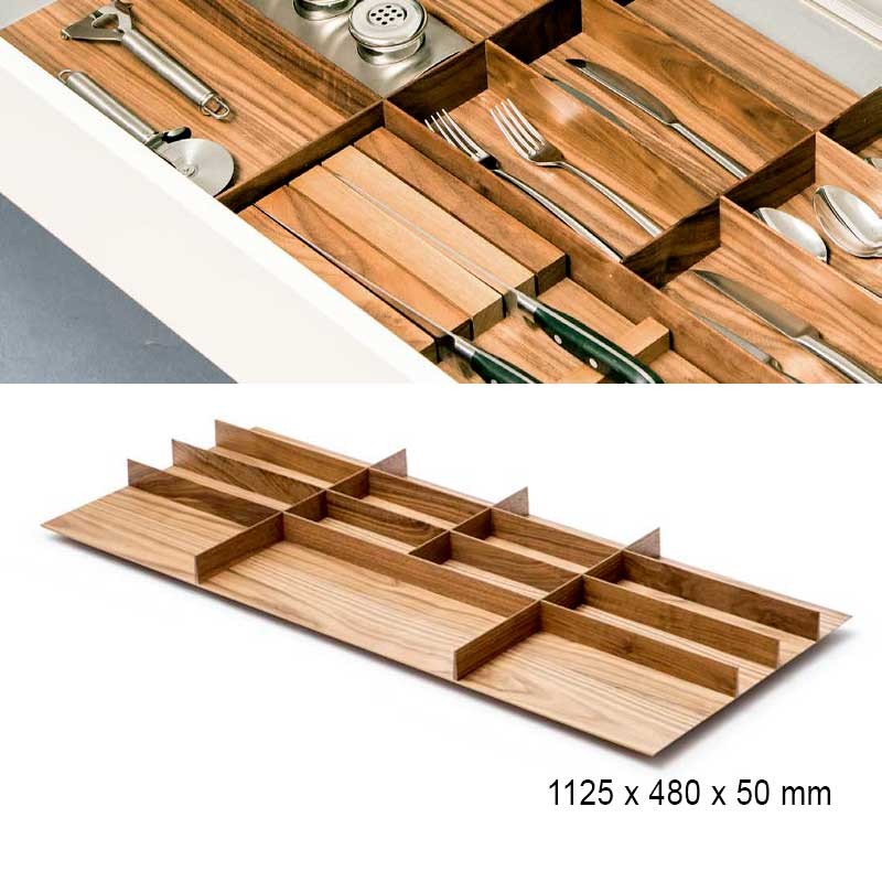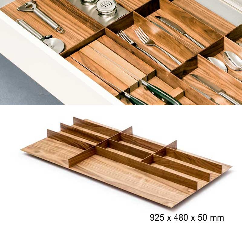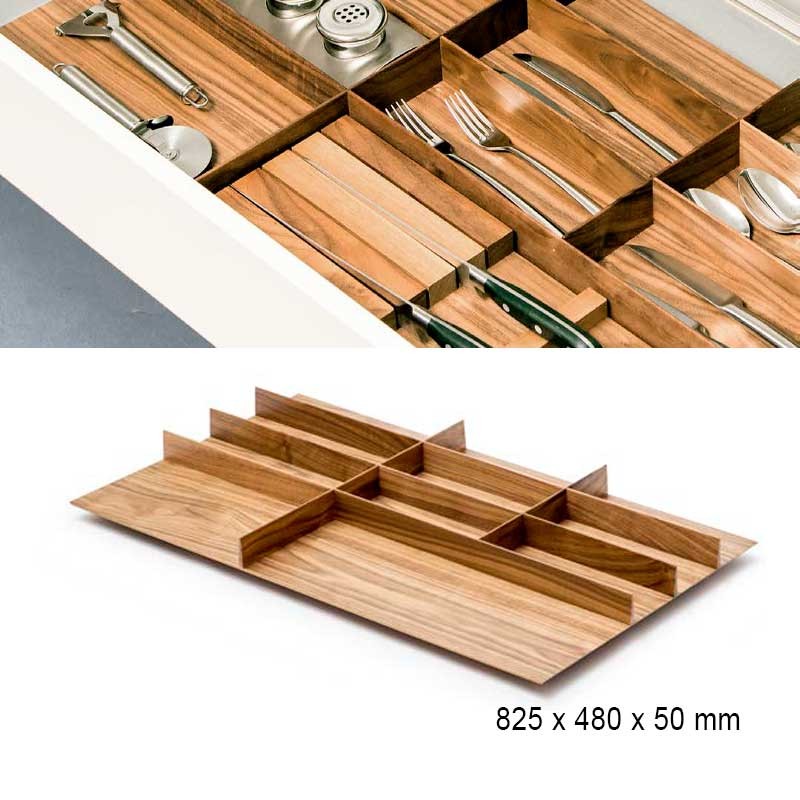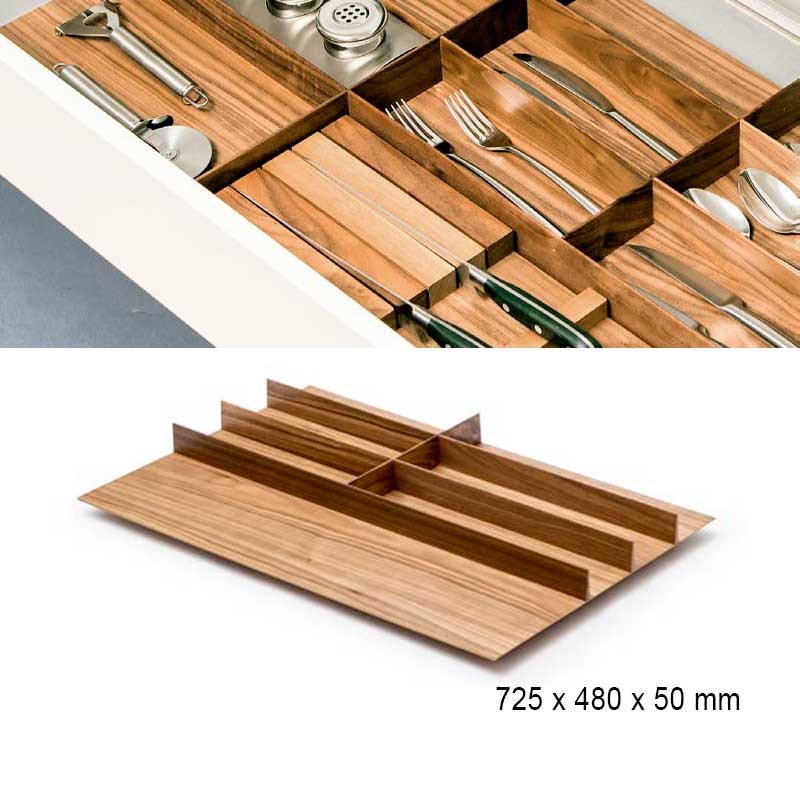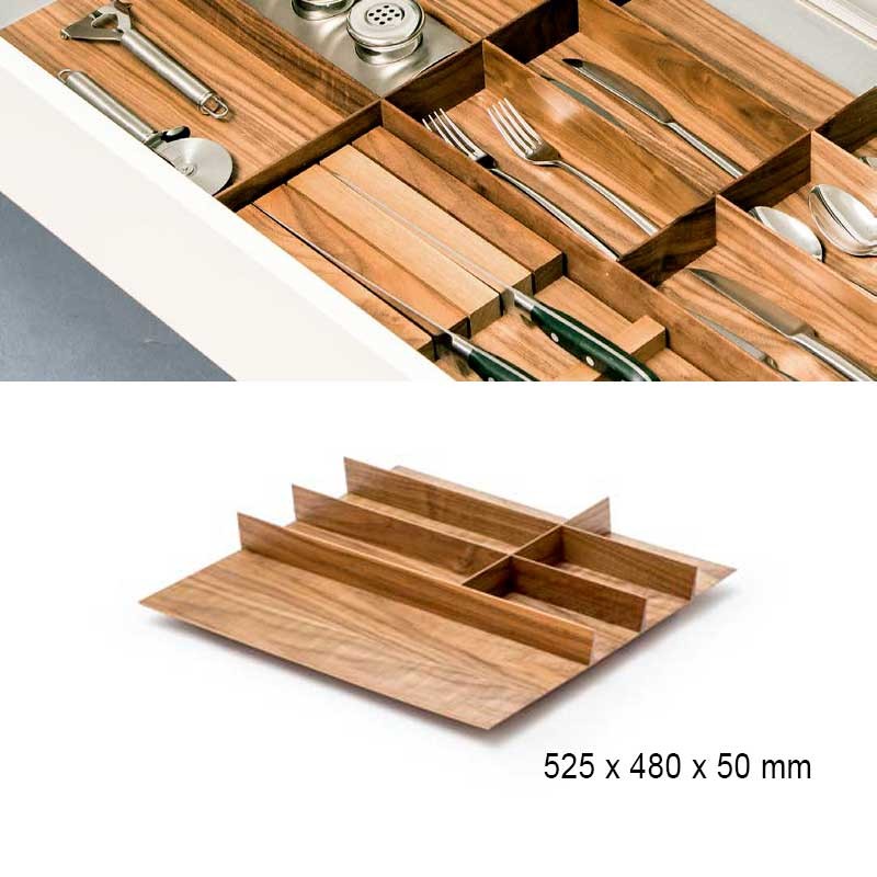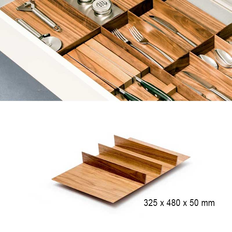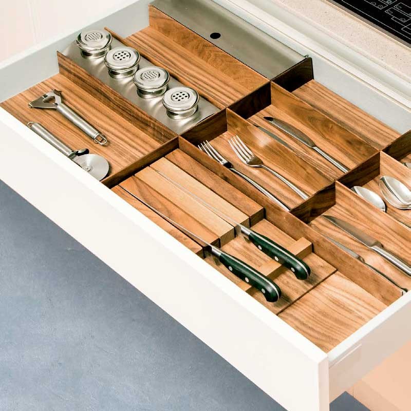 La Série Fineline de Cucine Oggi constitue une avancée dans le design des range-couverts en bois, fabriqués en base DM avec 4 mm de placage de noyer américain. Ses divisions triangulaires apportent une valeur esthétique et fonctionnelle supérieure, garantissant une organisation pratique et élégante.