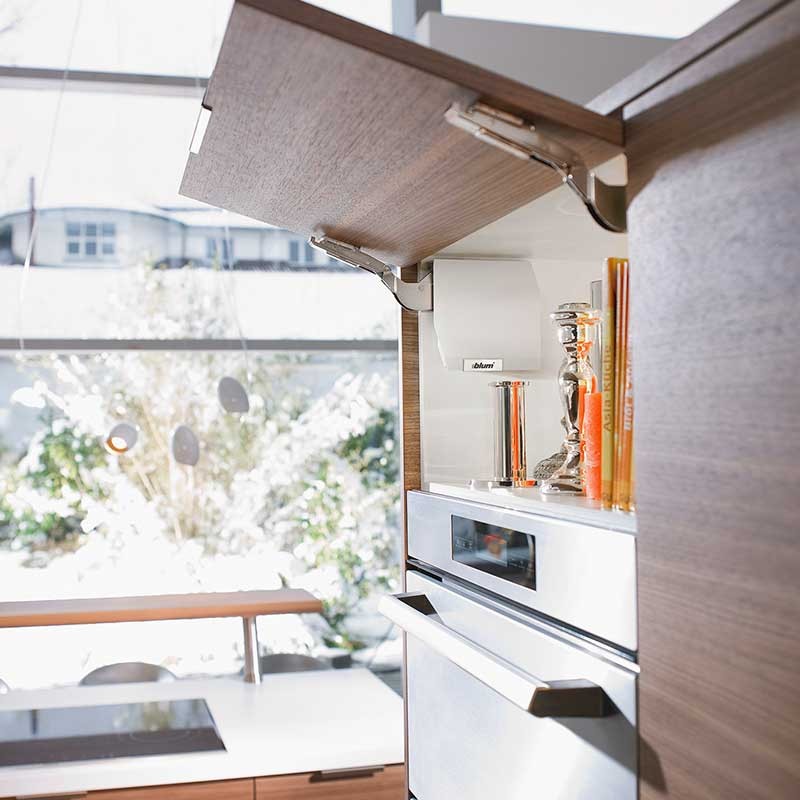 Développez Avec les charnières de cuisine AVENTOS HK-S, le panneau simple s'ouvre vers le haut, ce qui le rend particulièrement adapté aux armoires élevées.