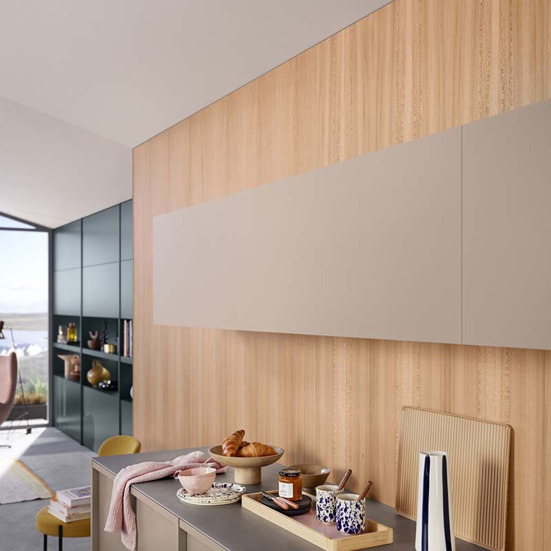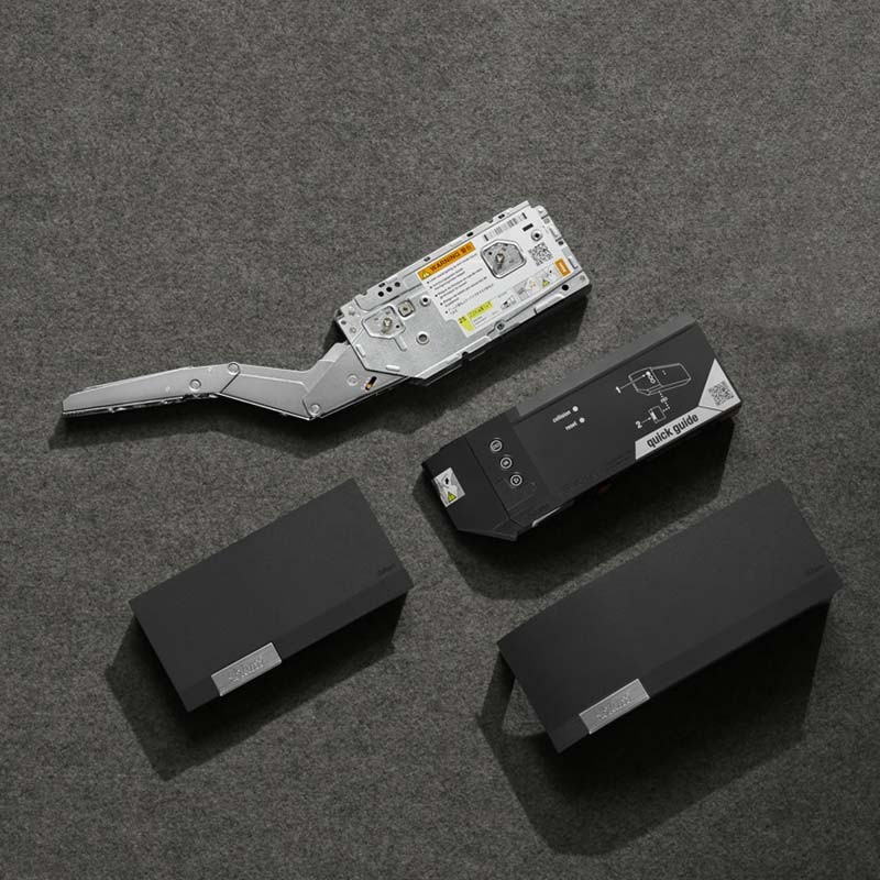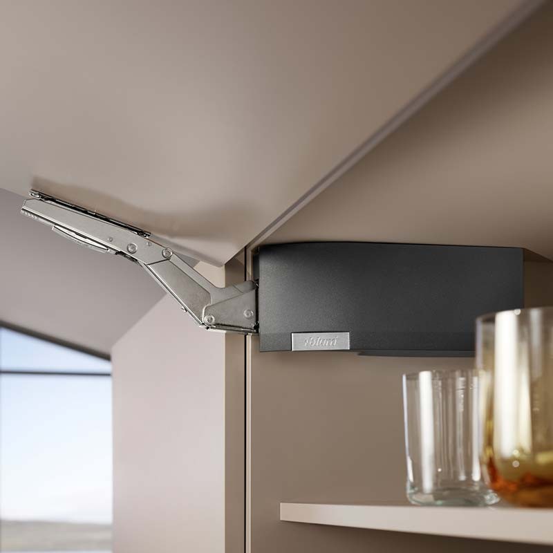 Grâce à son moteur intégré, une légère pression sur la façade du meuble suffit pour que la porte rabattable s'ouvre. Même les façades les plus grandes et lourdes se lèveront comme si la gravité n'existait pas. Le compas rabattable s'élève au-dessus de la zone de mouvement et l'utilisateur de la cuisine obtient un excellent accès à l'intérieur de l'armoire.