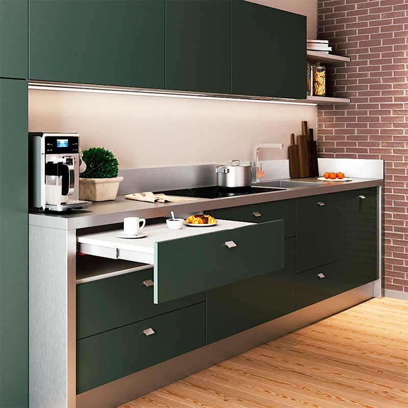 Développez Coulisses à rallonge en aluminium anodisé finition inox modèle Emuca Shot pour disposer d'une table ou plan de travail auxiliaire pour la cuisine.