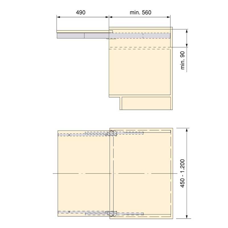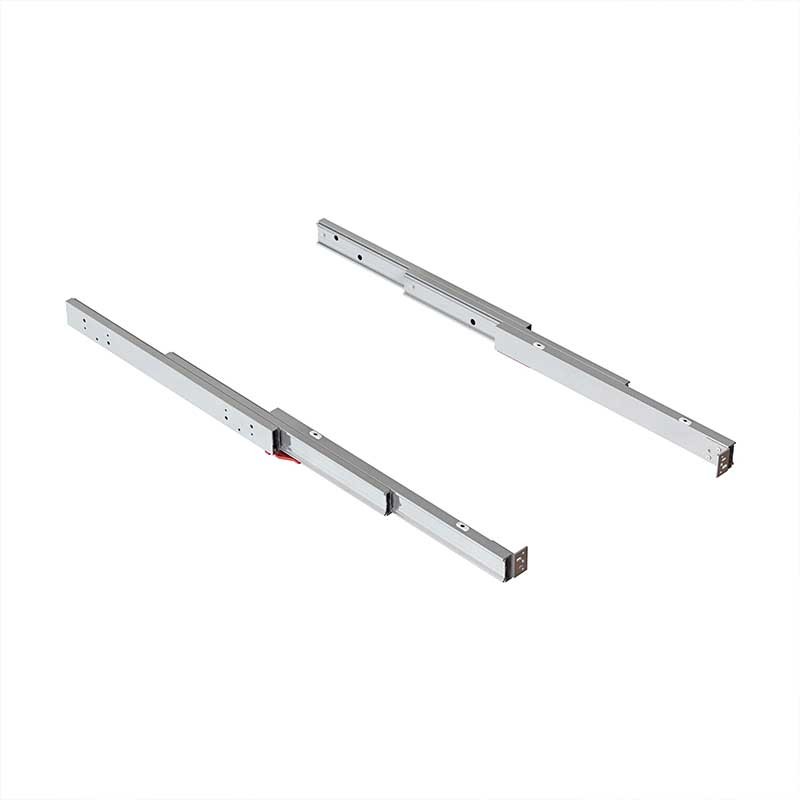 Le système doit être installé dans des modules d'une largeur comprise entre 450 et 1 200 mm et avec une profondeur minimale de 560 mm. Le système de guidage permet l'extraction d'une surface de 490 mm et une capacité de charge de 80 kg. Il dispose également d'un mécanisme de verrouillage de sécurité pour empêcher la fermeture accidentelle de la table. Le panneau constituant la surface de support n'est pas fourni.