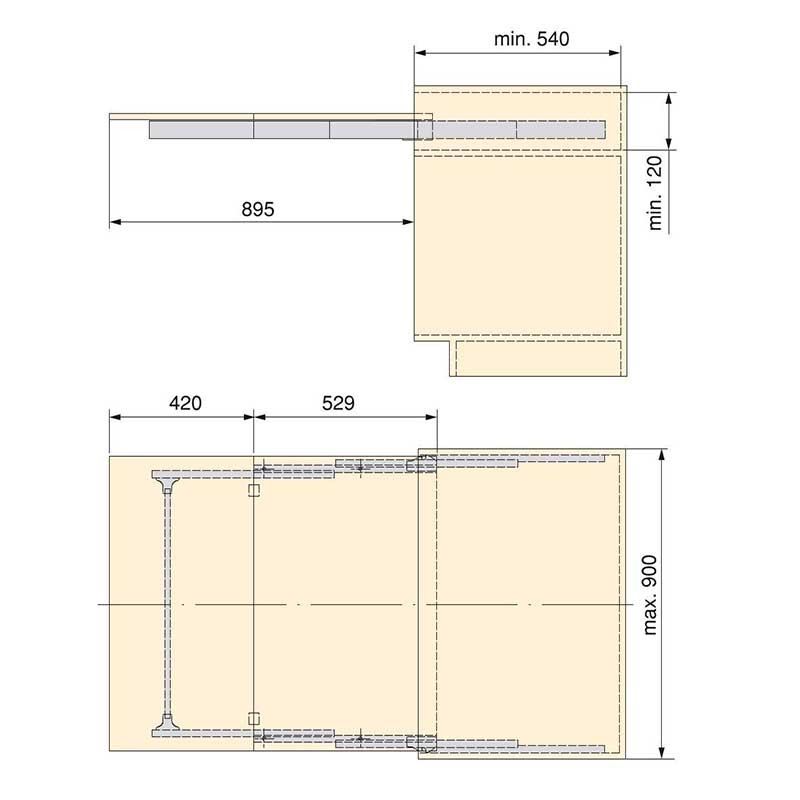 La table Lunch peut s'installer dans des modules d'une largeur maximale de 900 mm et d'une profondeur minimale de 540 mm. Les guides du système permettent l' extraction d'une surface de 895 mm et une capacité de charge de 60 kg. La table est constituée par les 2 panneaux qui se déplient grâce à des charnières qui sont logés dans le même compartiment que le système après utilisation. Elles disposent également d'un mécanisme de verrouillage de sécurité pour empêcher la fermeture accidentelle de la table. Pour les montages sur des modules d'une largeur supérieure à 900 et jusqu'à 1200 mm, un profil stabilisateur code 2045269 est prévu. La tablette constituant la surface de support n'est pas incluse.