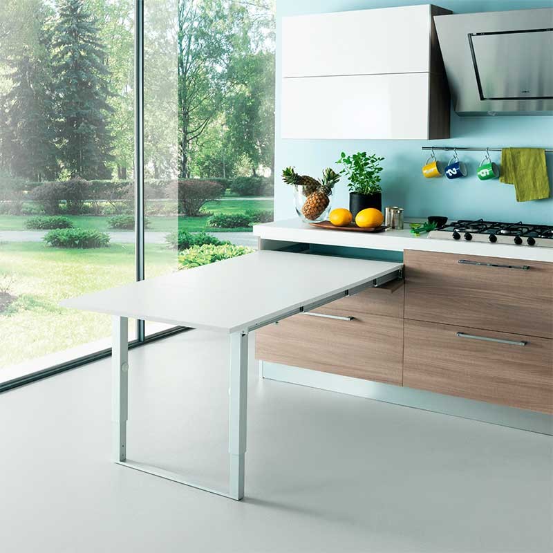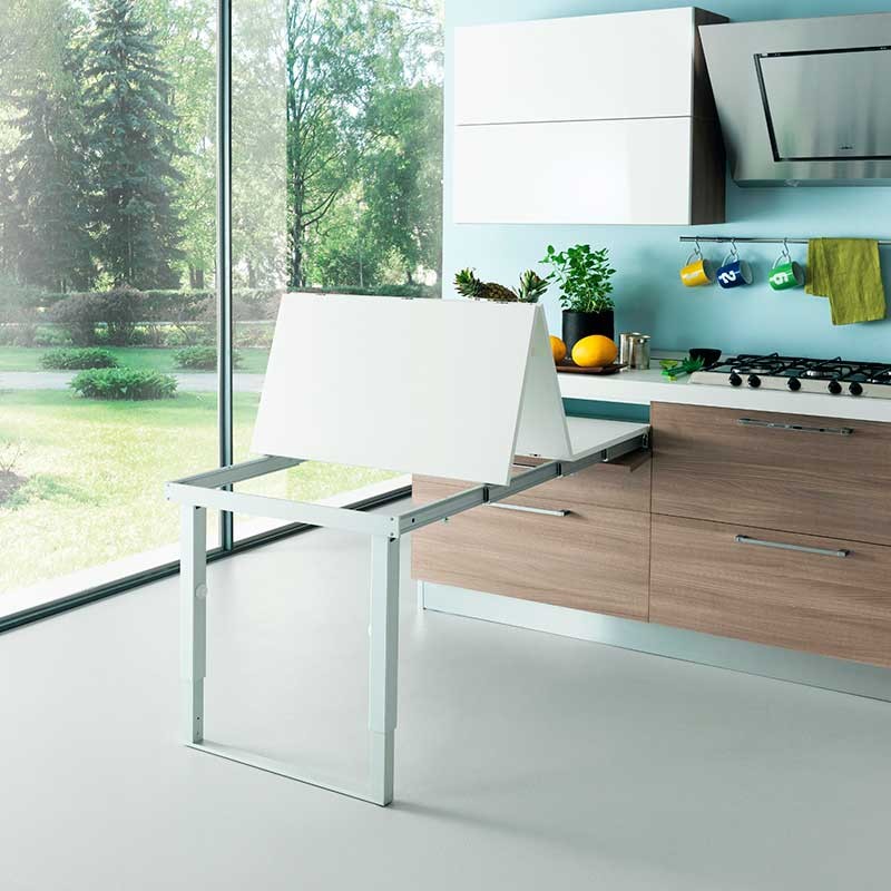 La table Party est conçue avec un système d'extraction pliable à double jambe télescopique, ce système a été conçu pour la cuisine, mais il peut se prêter à d'autres utilisations dans la maison. Le système Party peut être installé dans des modules d'une largeur de 900 mm et d'une profondeur de 560 mm, en permettant ainsi d'obtenir une longueur de table de 1380 mm et une capacité de charge de 100 kg.