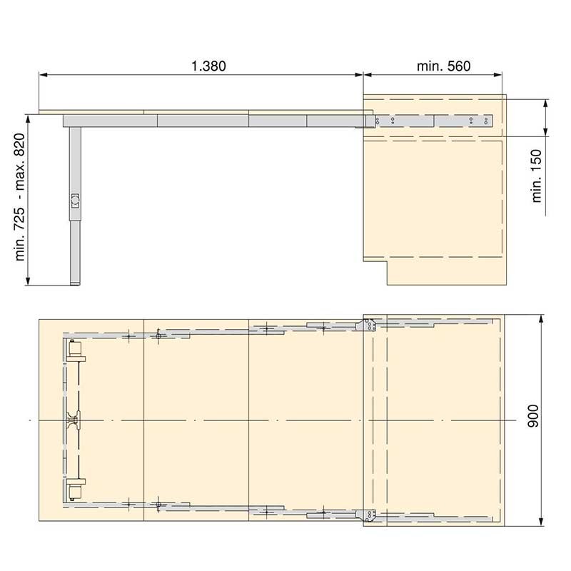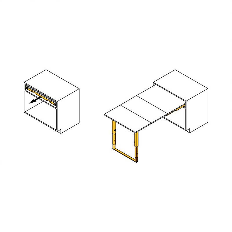 La table se compose de trois panneaux qui sont dépliés à l'aide de charnières, les panneaux restent logés dans le même espace que le mécanisme lorsque la table n'est pas utilisée. La façade du meuble après avoir conserver la table doit être équipée de charnières permettant son ouverture. La jambe est pliable et réglable en hauteur, en plus de la jambe et les guides sont équipés d'un système de verrouillage pendant l'utilisation de la table.