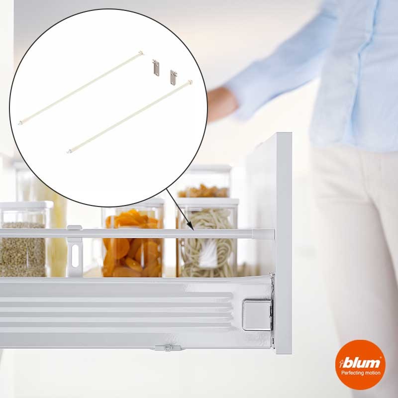 Jeu de tubes longitudinaux avec adaptateurs pour l'arrière des blocs-tiroirs Blum Metabox hauteur M (86 mm) profondeur 50 cm en blanc crème.
