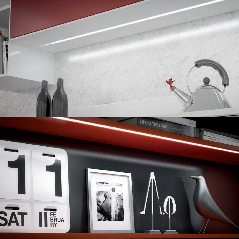 Développez Bande LED avec un insert fin et avec beaucoup de puissance d'éclairage grâce à la nouvelle bande LED Erp de 11,5 W/m qu'elle intègre. Arrêtez-vous sous les hauts meubles.