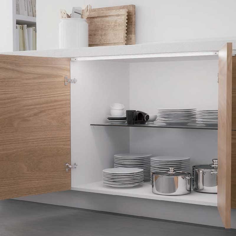 Le diffuseur en plastique blanc avec bande LED ErP de 6 W / m sur toute la bande rend l'intérieur du meuble parfaitement éclairé, montrant une lumière continue uniforme.