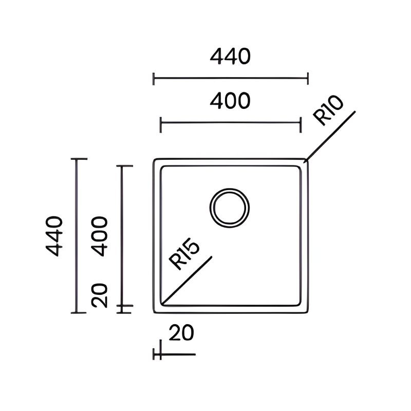 Développez Évier en acier inoxydable modèle Ferrara Plus de 440 x 440 mm pour installation sous plan, avec option d’installation affleurante ou filotop.