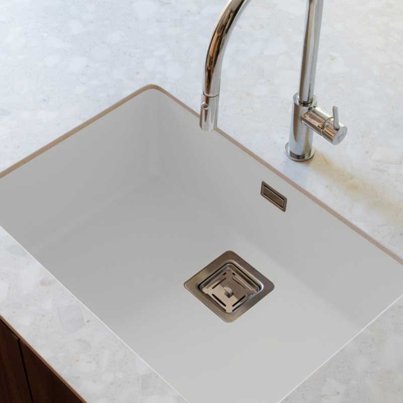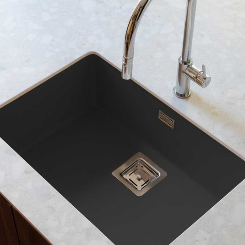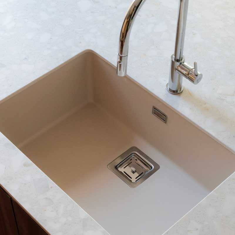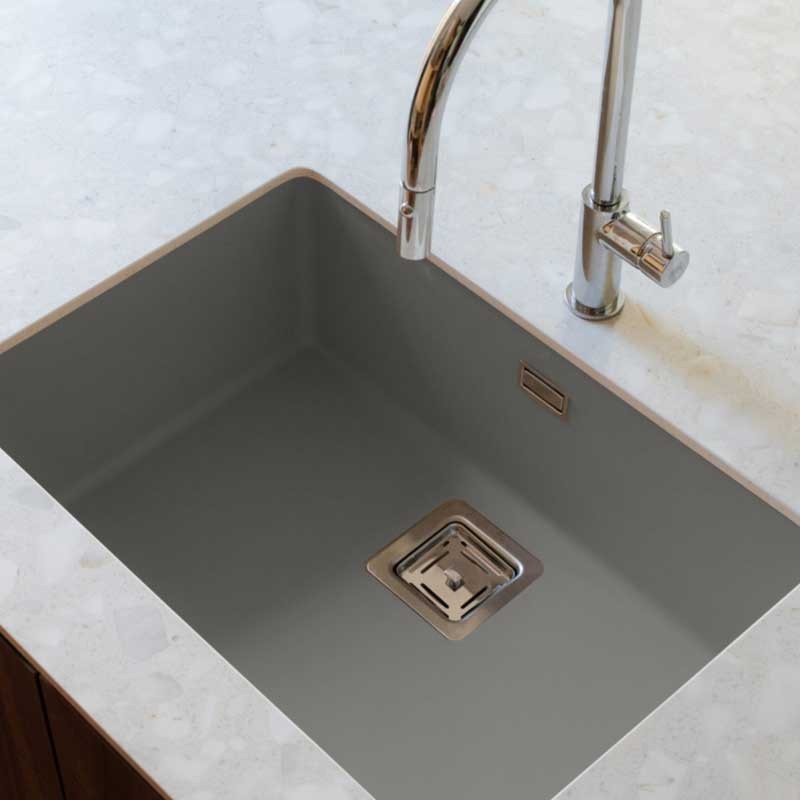 Développez Évier en granit Hekla® modèle Zie 60 finition mate pour installation sous plan ou sur plan dans des meubles de 70 cm minimum.