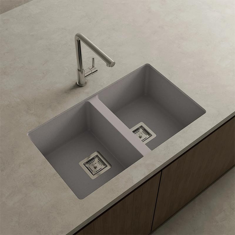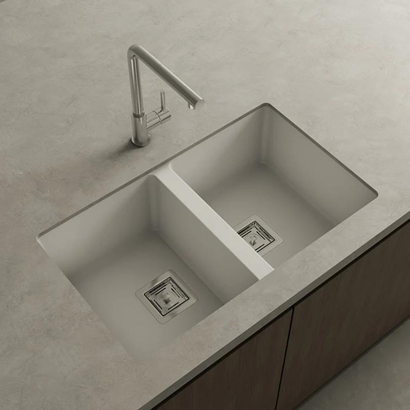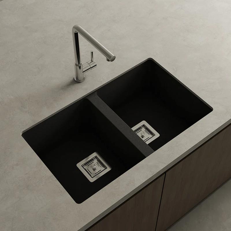 Développez Évier en granit Hekla® modèle Zie 70 à deux bacs finition mate pour montage sous-plan ou sur-plan dans des meubles d'au moins 80 cm.
