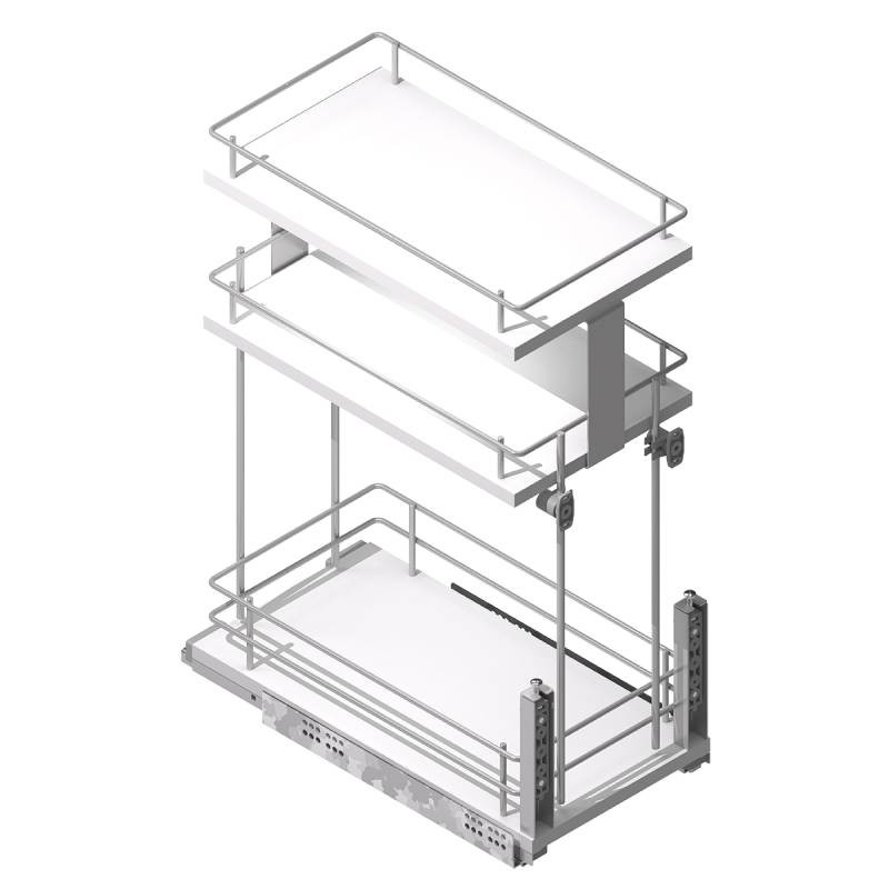 Module d’extraction avant pour meubles de cuisine en acier chromé avec 3 étagères avec des bases de mélamine blanche pour stocker des bouteilles, des bateaux et d’autres articles.