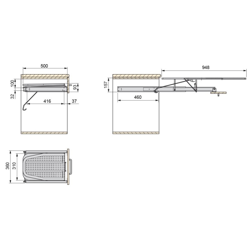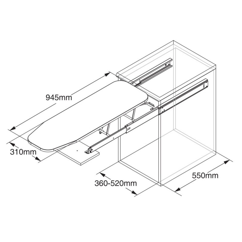 Fer à repasser Fer a fait de l'acier avec une finition peinte en blanc. Les guides qui intègre votre structure vous permettre d'être parfaitement intégré dans les meubles quand il est plié. Pour son installation nécessite un cabinet avec une profondeur minimale de 500 mm et une largeur intérieure de module de 360mm et 520mm.