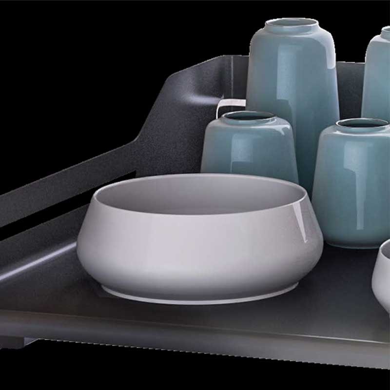 Les étagères peuvent être facilement retirées pour le nettoyage et sont conçues avec le bord fermé, pour éviter que les bouteilles ne basculent et que les petits ustensiles ne tombent. Mouvement doux et silencieux.