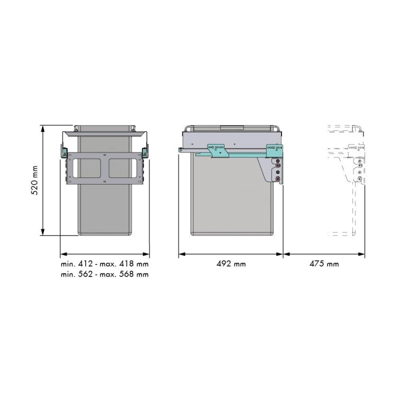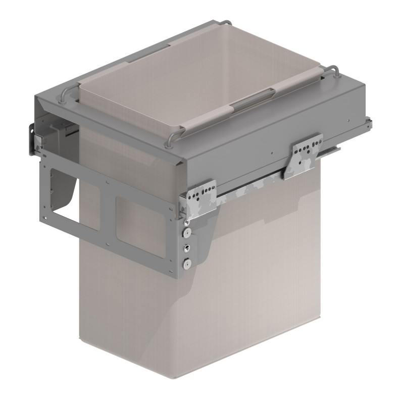 Développez Trémie amovible avec façade amovible et paniers en tissu gris lavable, guides Grass en acier avec fermeture amortie. Disponible en format simple ou double selon la largeur du meuble.