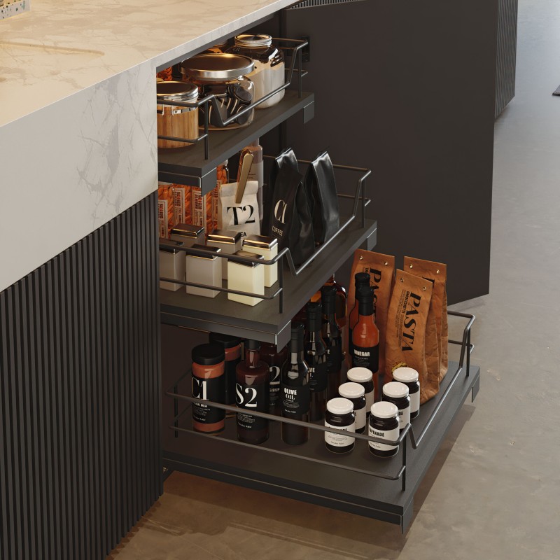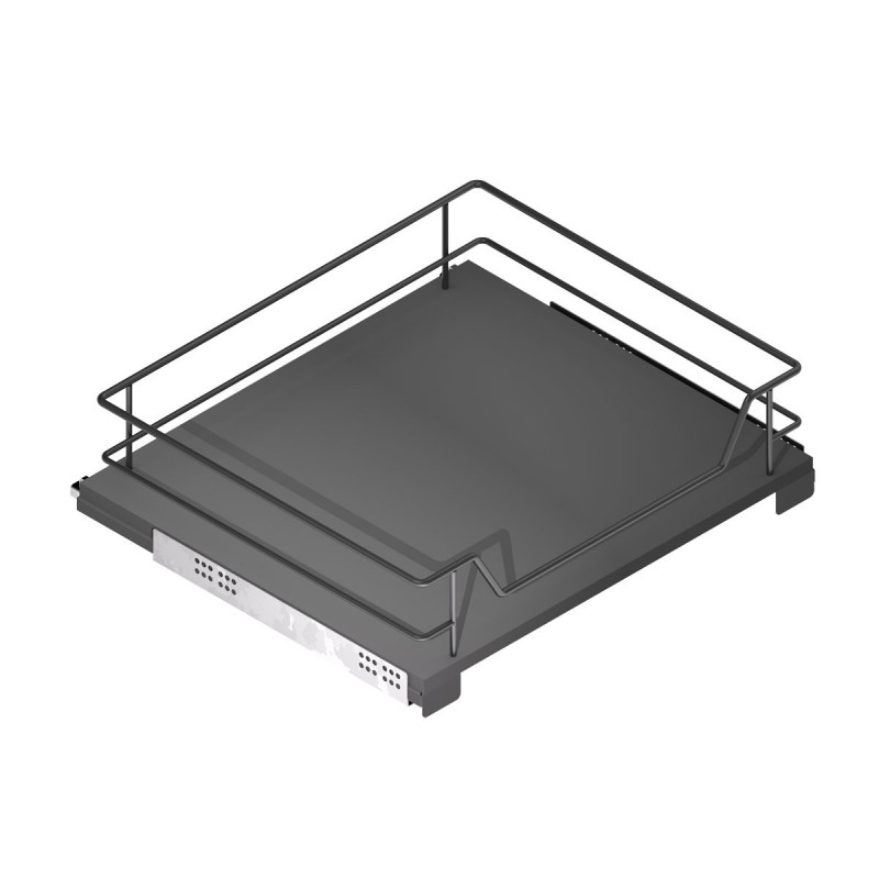 Développez Panier coulissant Compact en couleur anthracite avec base en mélamine et glissières cachées à extraction totale. Supporte jusqu'à 30 kg de charge.