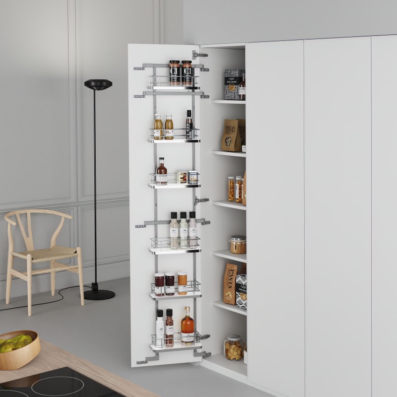 Développez Étagère de garde-manger Compact pour colonne de cuisine, fabriquée en acier avec finition chromée, avec paniers et bases en mélamine résistante.