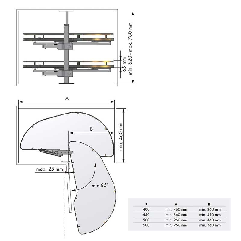 Module amovible pour meubles d’angle de cuisine. Double hauteur du plateau pour une meilleure utilisation de l’espace. Chaque plateau sort indépendamment.
