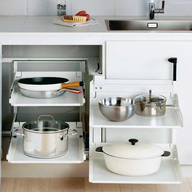 L'opération est simple: ouvrez la porte, tirez la poignée et les étagères avant pivotent complètement hors du meuble.