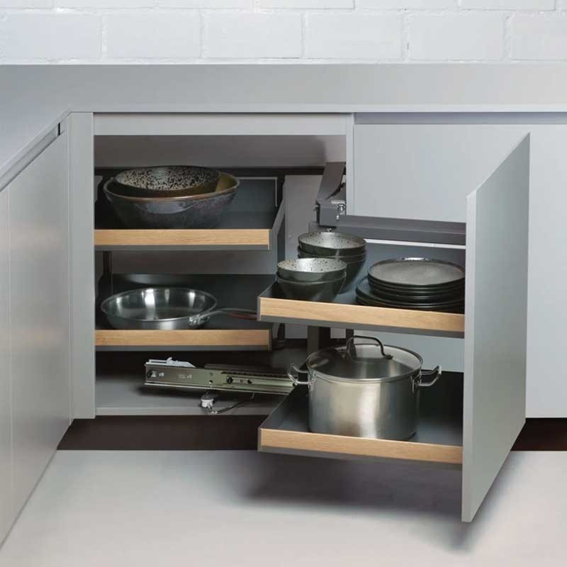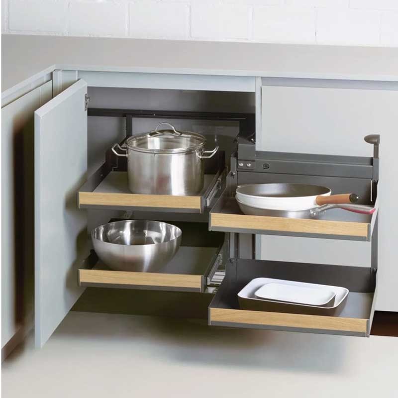 L'opération est simple: ouvrez la porte, tirez la poignée et les étagères avant pivotent complètement hors du meuble.