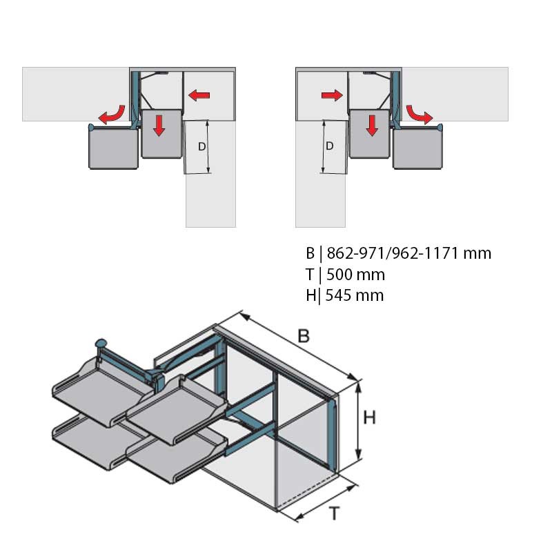 Développez Coin amovible en finition Libell pour portes battantes, qui peut être monté à droite ou à gauche (choisir le modèle). Le mécanisme n'est pas fixé à la porte, uniquement à l'intérieur du meuble.