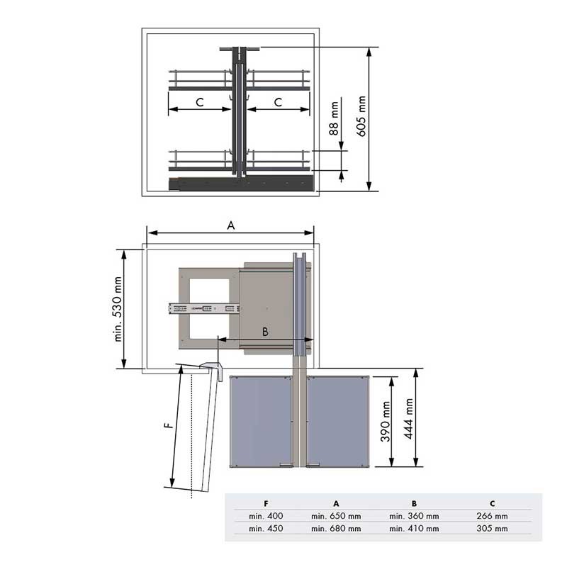 Module de rack amovible articulé pour meuble d'angle de cuisine. Double corps et le double de la hauteur des plateaux pour plus de capacité et d'utilisation de l'espace.