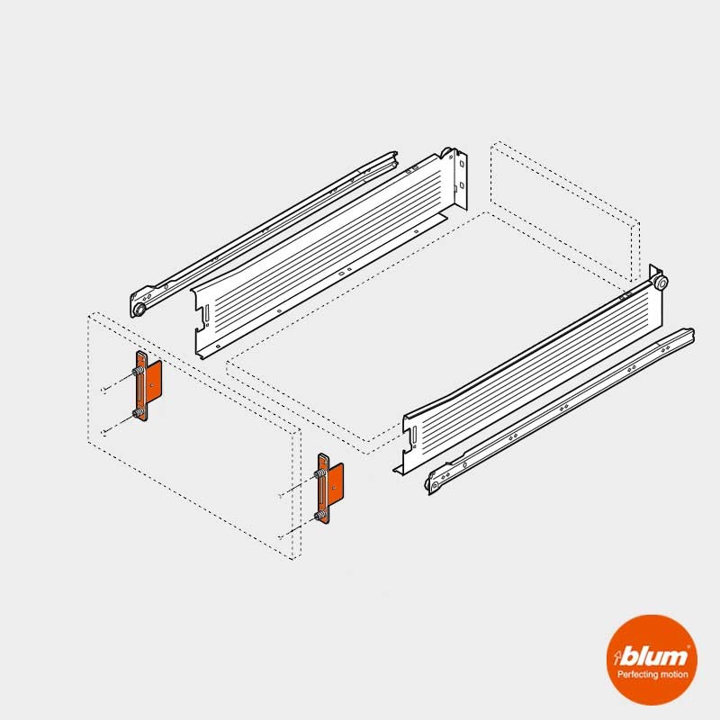 Développez Jeu de fixations avant au moyen de vis pour tiroirs et blocs-tiroirs Blum Metabox. Compatible avec tous les modèles sauf Metabox hauteur N.