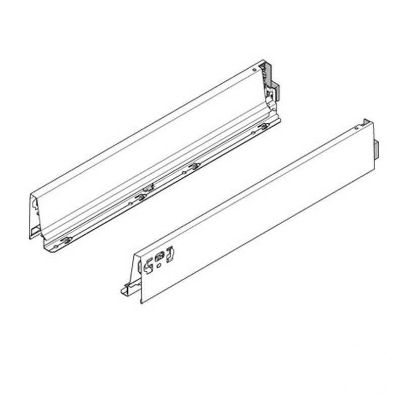 Développez Les profils et les fermetures latérales en acier pour masquer les guides pour les tiroirs et les blocs-tiroirs de cuisine Blum. Disponible en blanc ou gris et différentes tailles.