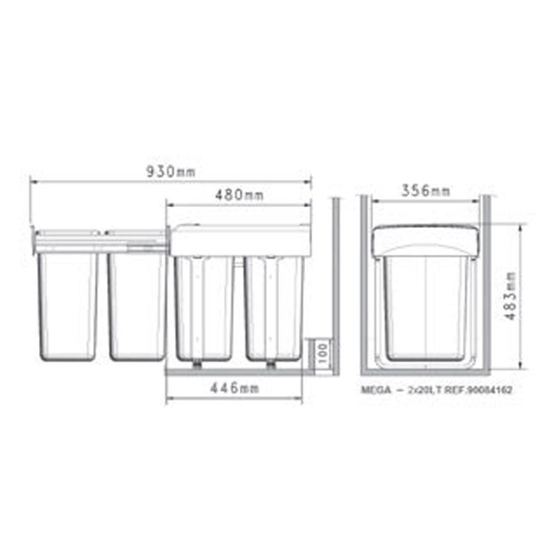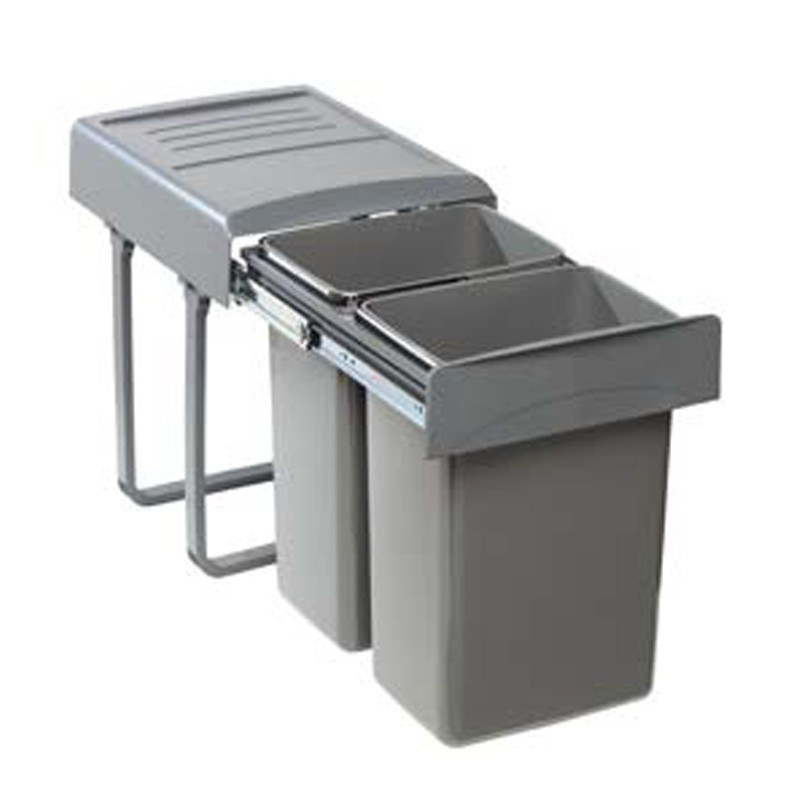 La structure de ces poubelles se fixe à la partie inférieure (base) des meubles de cuisine, permettant une extraction en douceur des bacs manuellement grâce aux glissières latérales situées dans leur partie supérieure. Le couvercle restera fixe à l’intérieur du meuble, évitant ainsi de devoir le soulever manuellement.