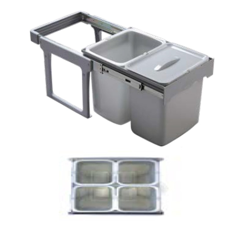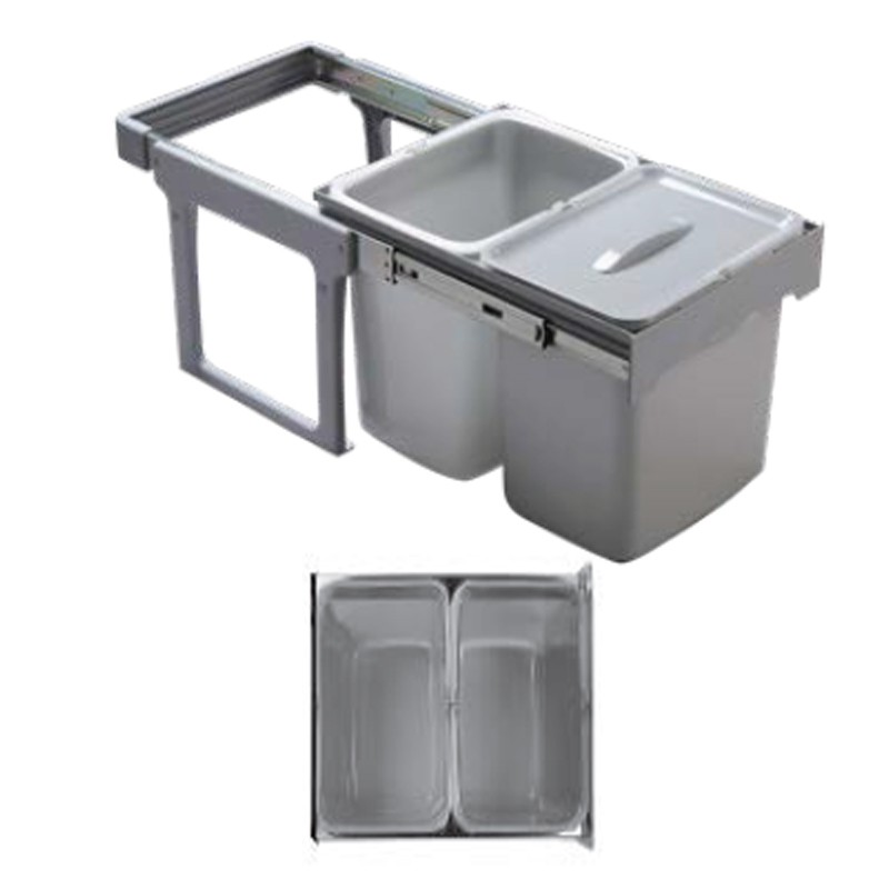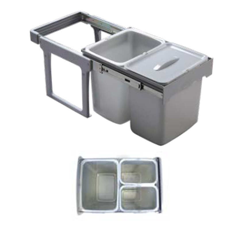 La structure de ces poubelles se fixe à la partie inférieure (base) des meubles de cuisine, permettant une extraction douce des bacs manuellement grâce aux guides latéraux qu'elle intègre dans sa partie supérieure.