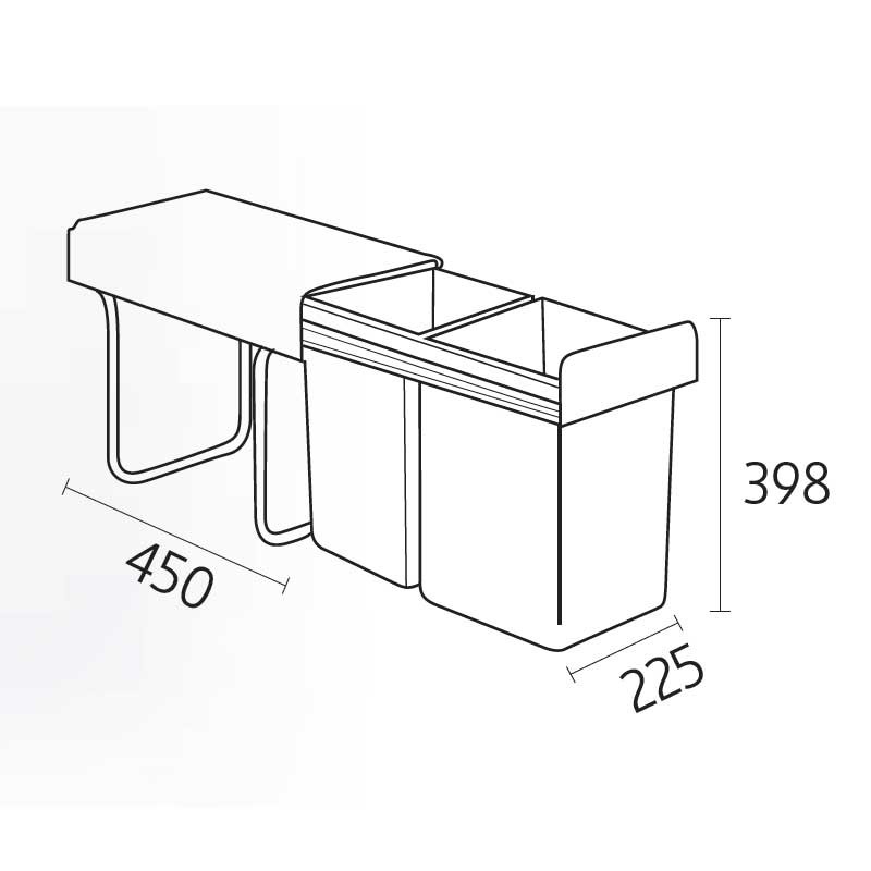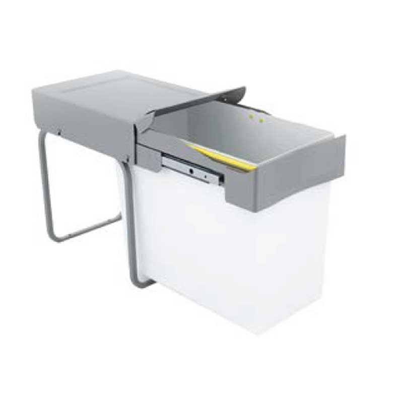 La structure de ces poubelles se fixe à la partie inférieure (base) des meubles de cuisine, permettant une extraction en douceur des bacs manuellement grâce aux glissières latérales situées dans leur partie supérieure. Le couvercle restera fixe à l’intérieur du meuble, évitant ainsi de devoir le soulever manuellement.