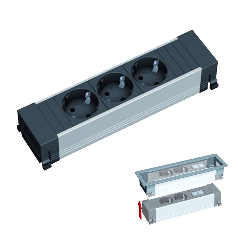 Développez Boîte compacte avec 3 prises pour l'installation dans les plans de travail ou des meubles de cuisine. Installation rapide et facile. Cadre extérieur en acier inoxydable.