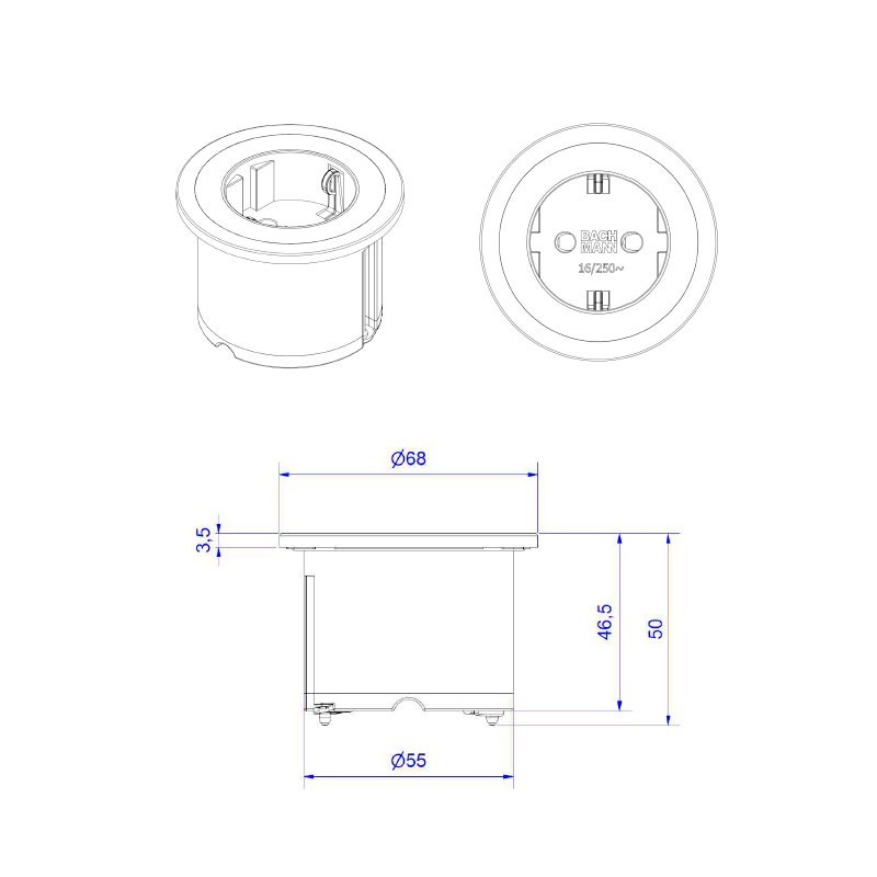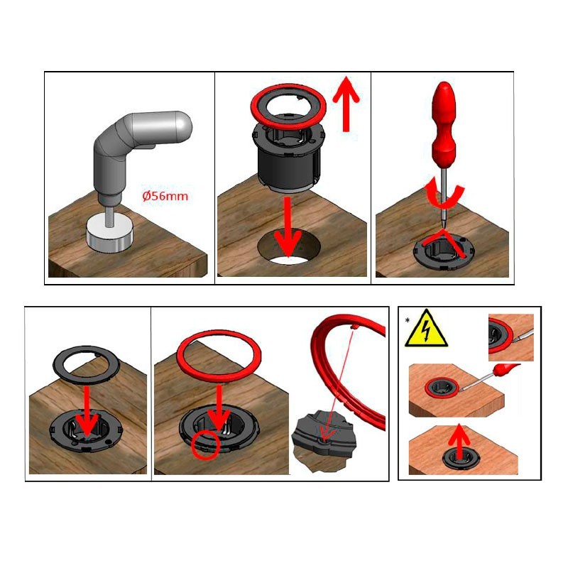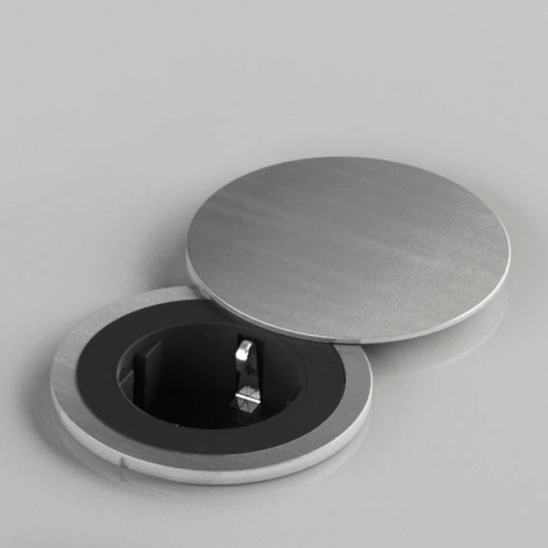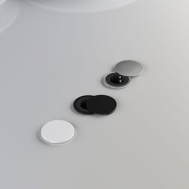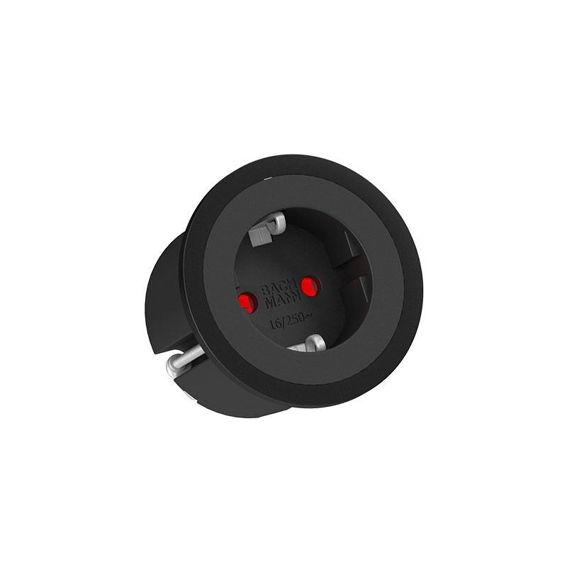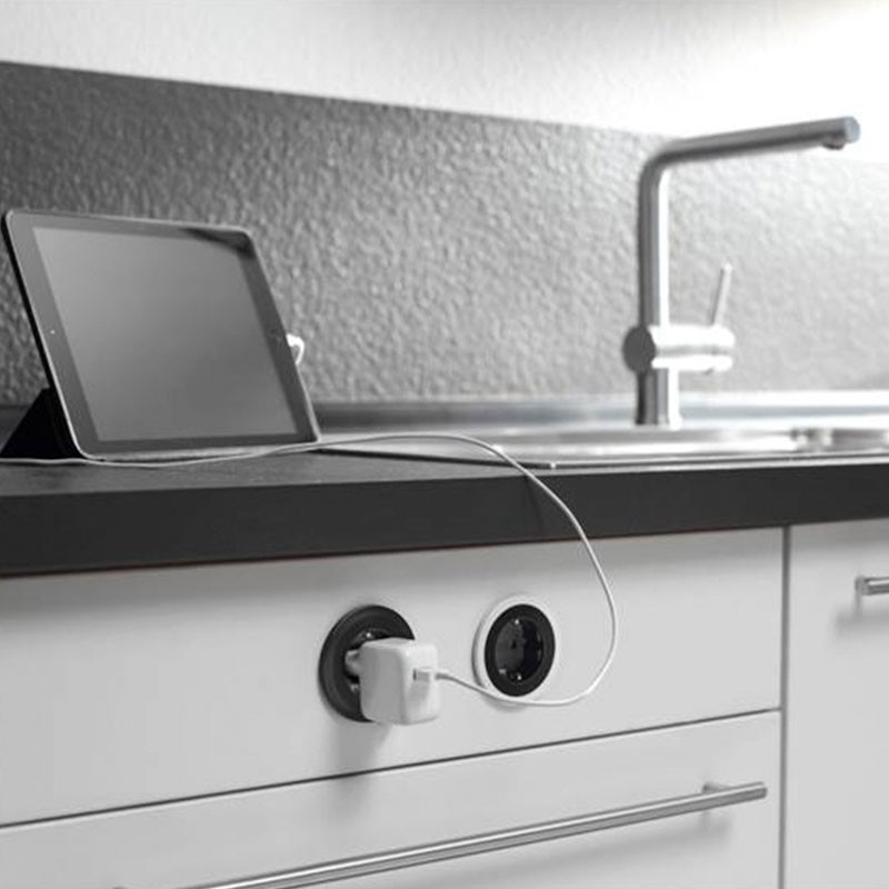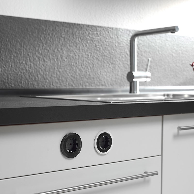 Développez Brancher ronde à encastrer dans le mur ou dans les meubles de cuisine avec une prise Schuko noire et 3 bagues extérieures interchangeables incluses dans 3 finitions différentes ; blanc, noir et inox.