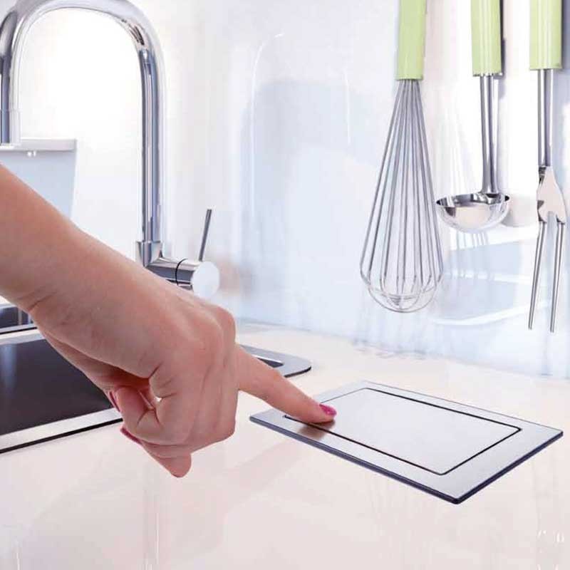 Développez Bande de puissance pour les comptoirs de cuisine modèle Flip Arrière avec 2 coups de rouge Schuko et 1 recharge USB. Extérieur: en acier inoxydable brossé.