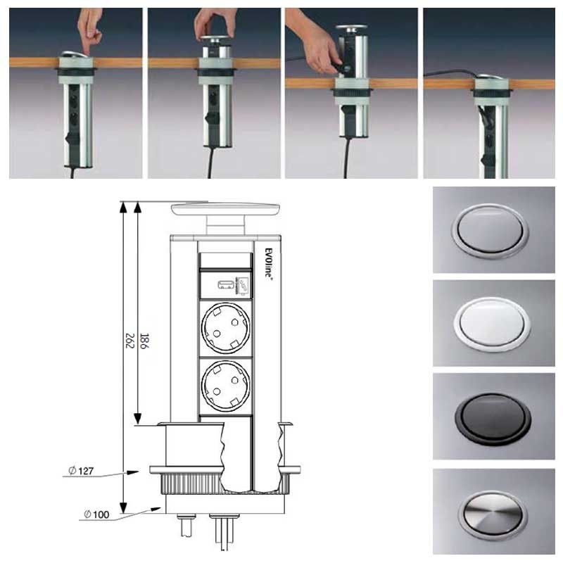 Développez Tour de vérins de levage pour les comptoirs de cuisine modèle Evoline avec 2 coups de rouge Schuko et 1 recharge USB. Différentes finitions au choix.