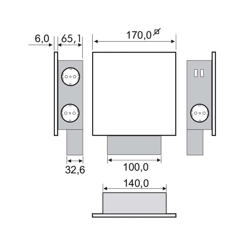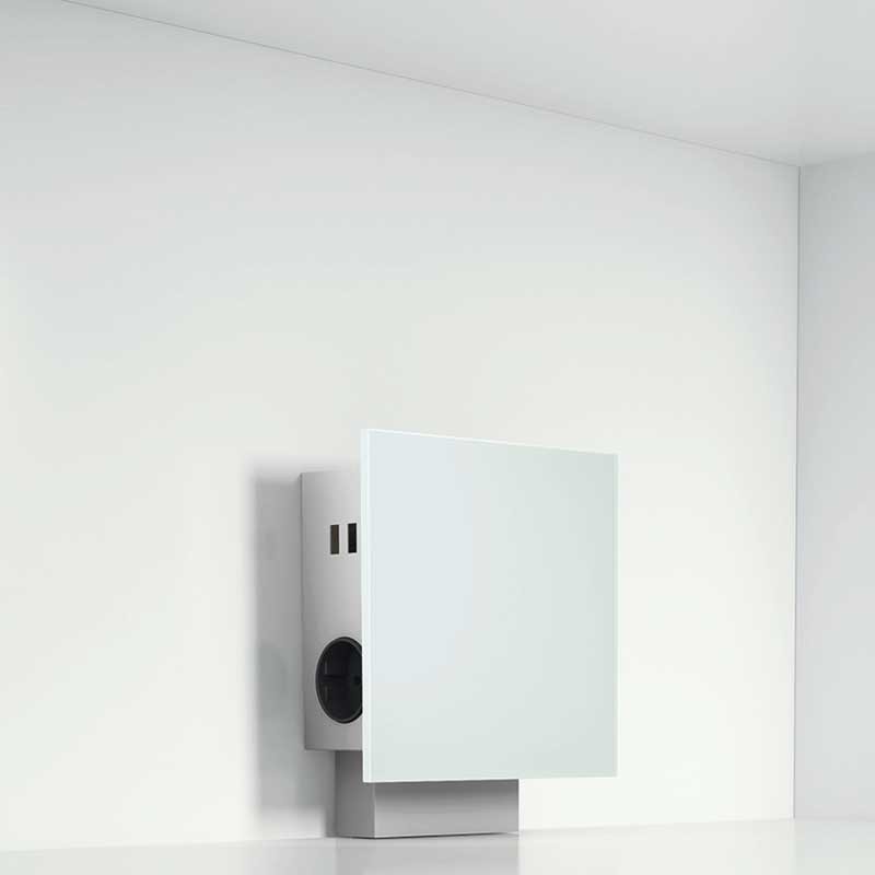 Développez Tour de vérins verticaux pour la cuisine, pour Pouvoir en Verre avec 3 coups de rouge Schuko côté et de 2 ports USB pour la recharge. Avant finition en verre blanc et boîtier en acier inoxydable.