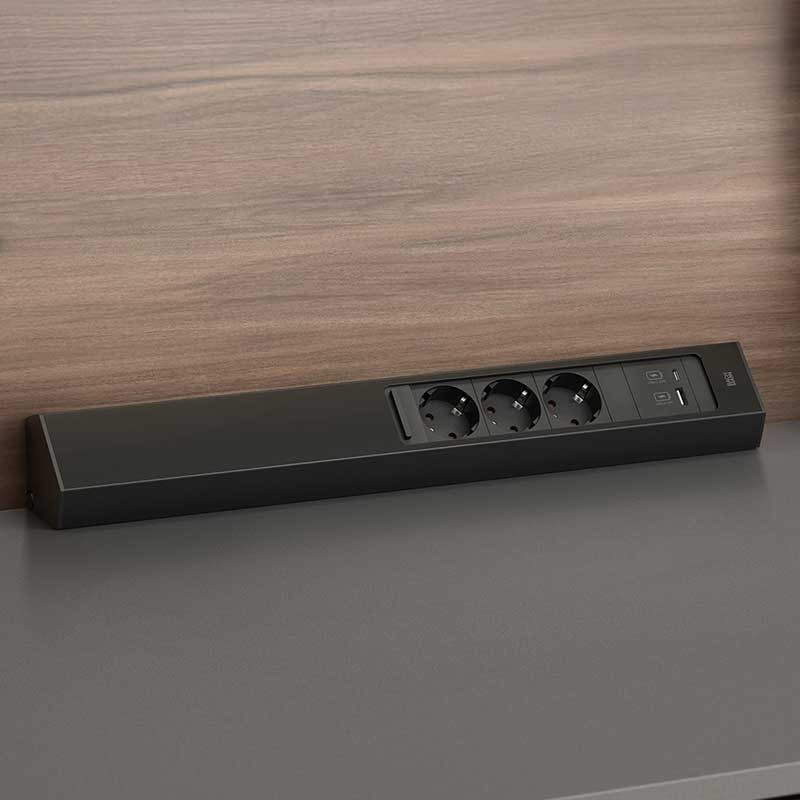 Développez La cornière Casia 2, en métal avec une finition noire anodisée, dispose de 3 fiches Schuko et de 2 ports USB 22W, l'un de type A et l'autre de type C. Parfait pour une installation dans les coins.