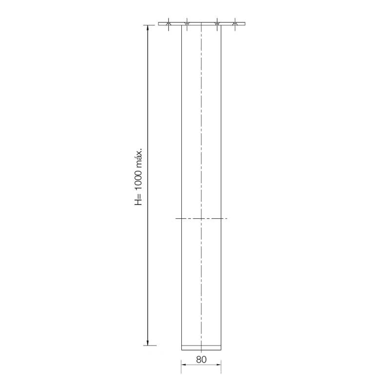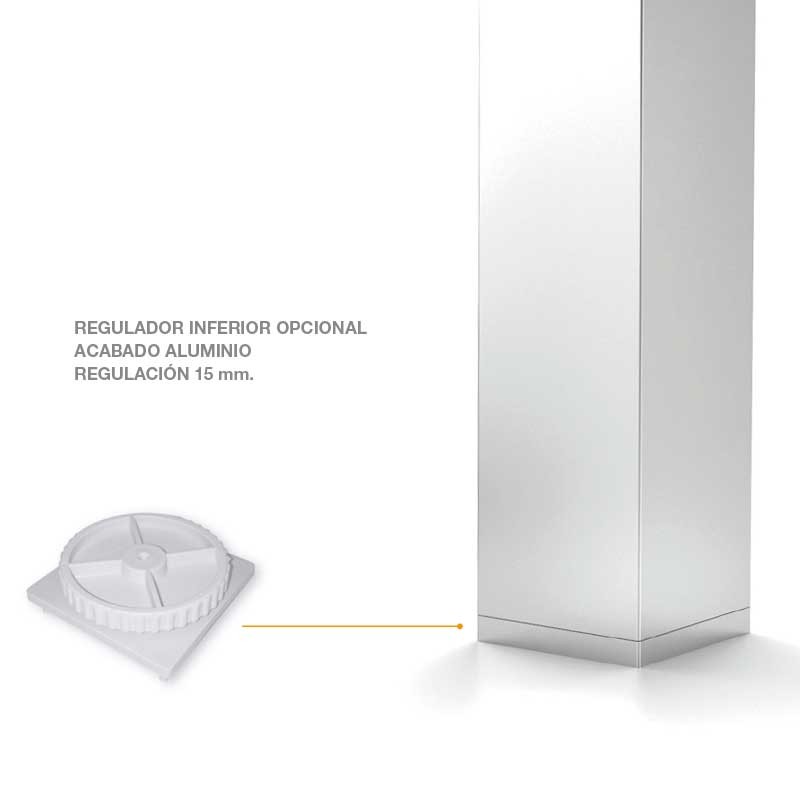 Développez Pied carré sur mesure pour péninsule de cuisine, section 80x80 mm et hauteur standard de 1000 mm en aluminium anodisé. Disponible en finitions aluminium, blanc mat et noir mat, avec option de régulateur inférieur.